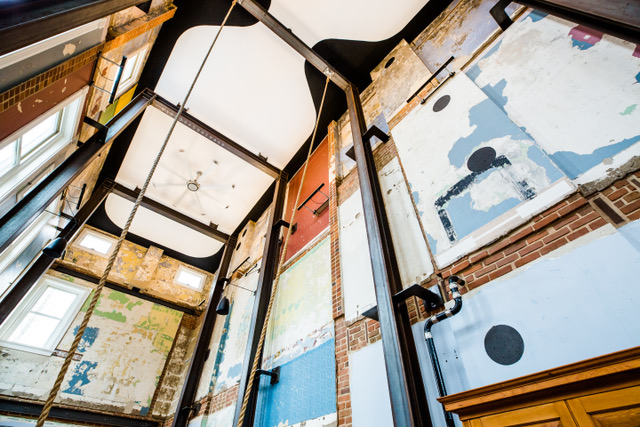 A description of the art installation on the Swing House website reads, “Reinforced by the hourglass shape on the ceiling, the movement of the swing mimics the travel of a pendulum, again, referencing the passage of time in the revealed history expressed on the walls; the swing is not only for pleasure, but is also a vehicle for contemplation.”